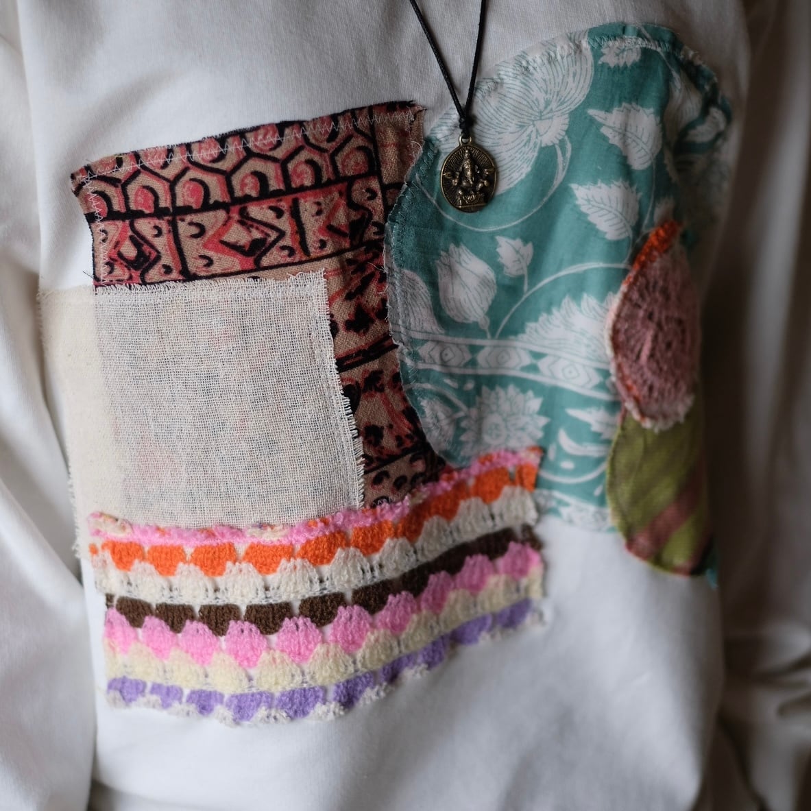エスニック柄パッチワークリメイクスウェット。
